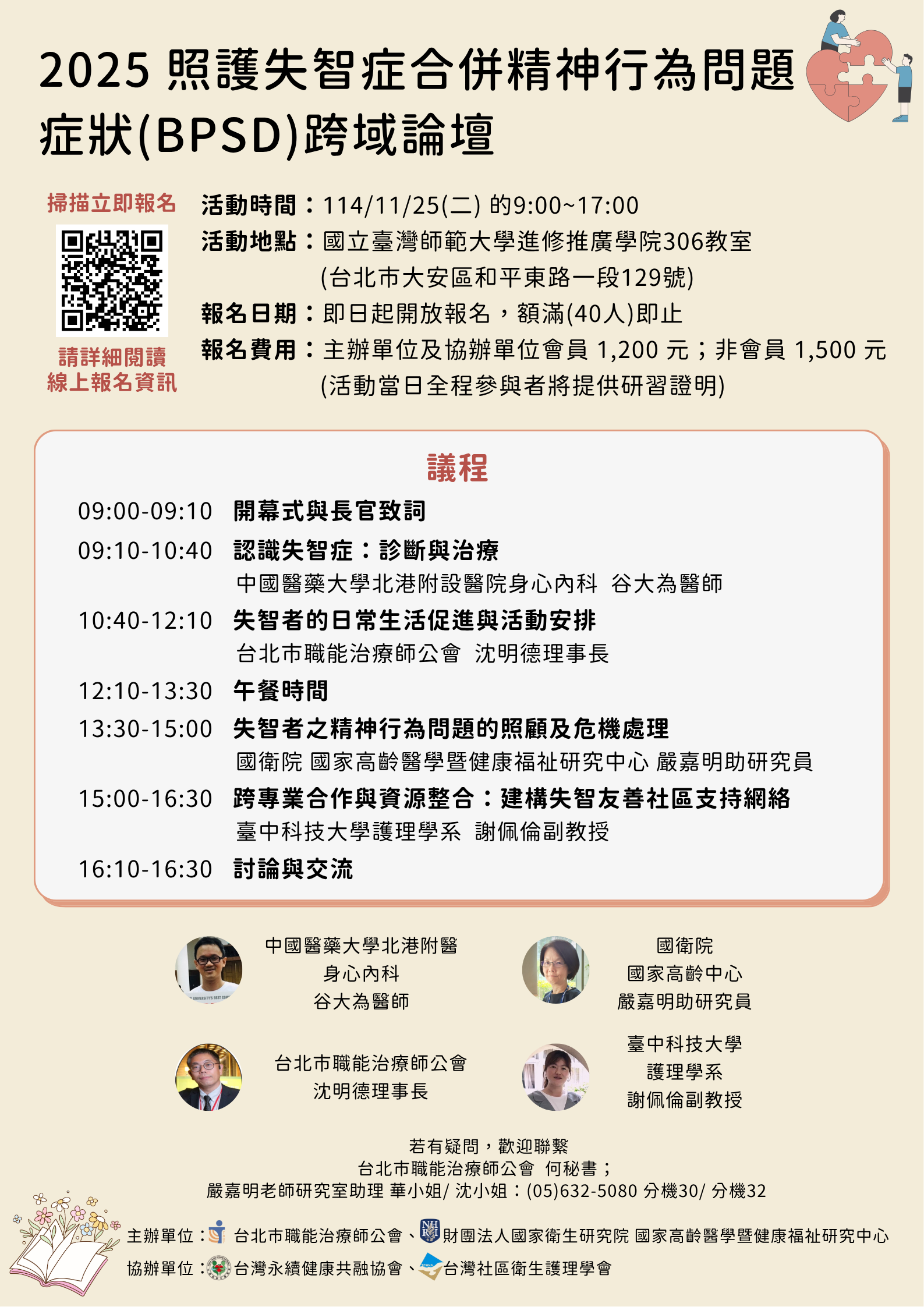10/09 【繼續教育課程公告】本會於114年11月25日(二)09:00-17:00舉辦「照護失智症合併精神行為問題症狀(BPSD)跨域論壇」