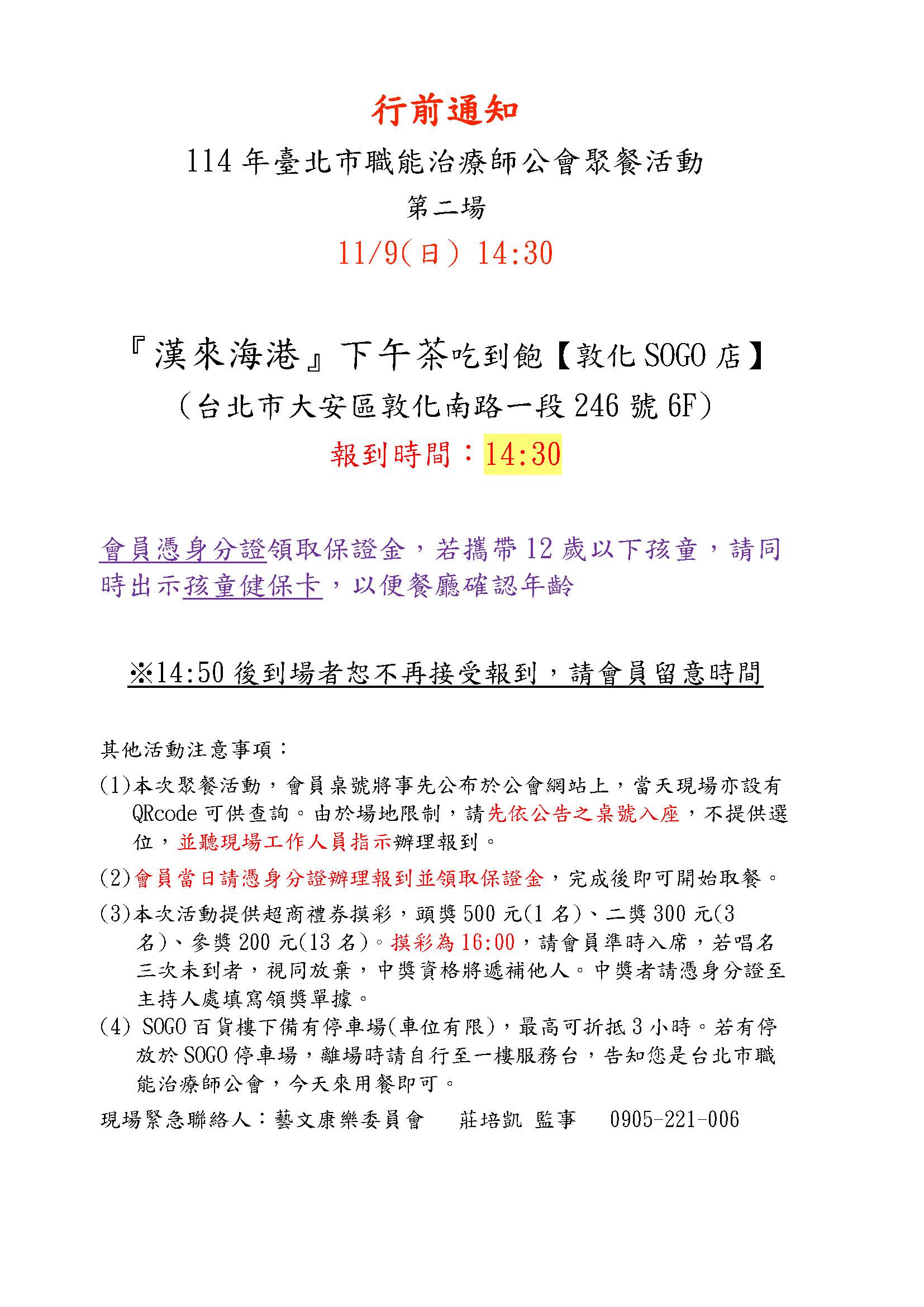 【行前公告】114年臺北市公會聚餐活動行前通知-114年11月9日(日)下午14:30,第二場次。