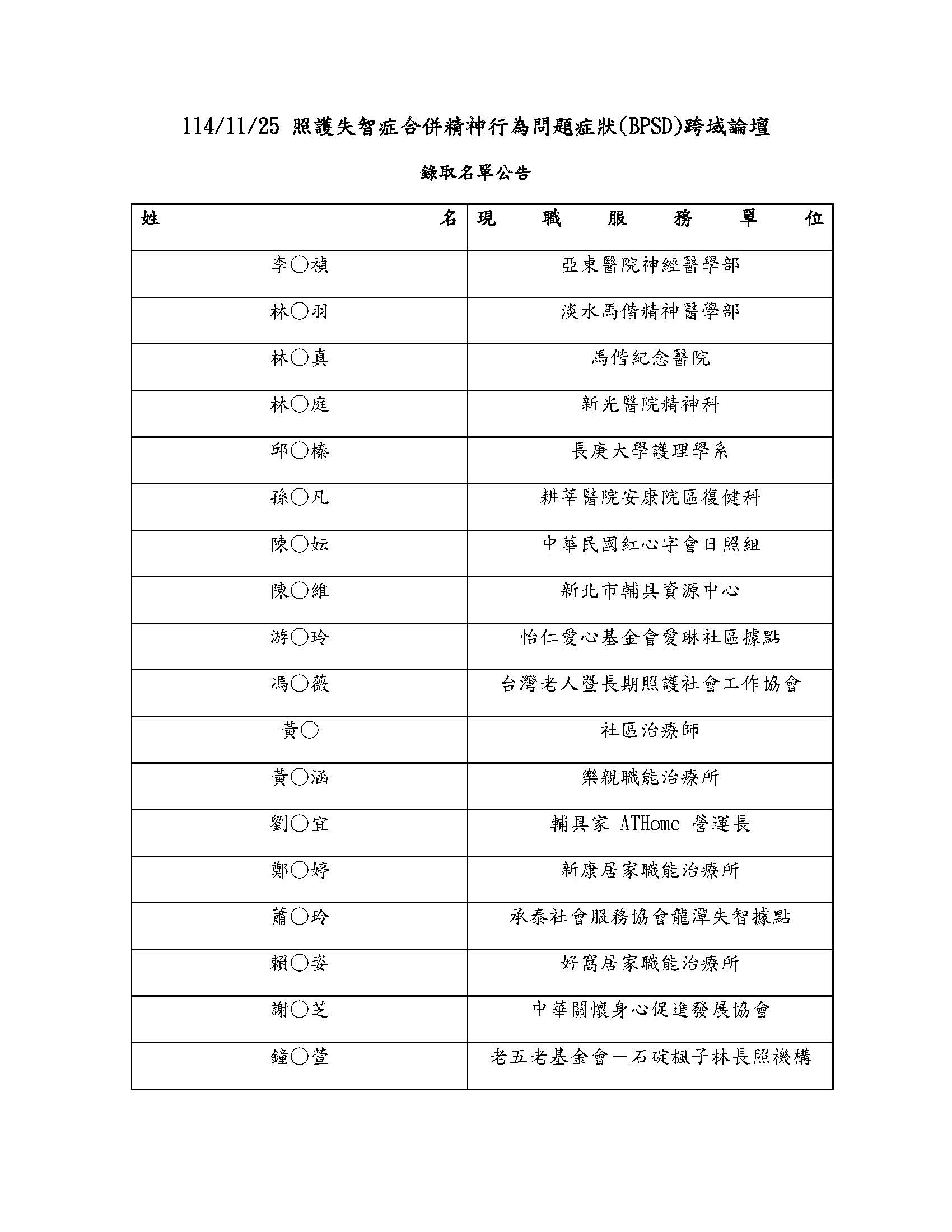 19 11 本會訊息 114年度社團法人臺北市職能治療師公會繼續教育課程 《照護失智症合併精神行為問題症狀(BPSD)跨域論》 課程資訊 課程日期:民國114年11月25日(星期二),上午08:40 - 17:00 課程地點:國立臺灣師範大學進修推廣學院306教室 (地址:臺北市大安區和平東路一段129號) 錄取名單公告: