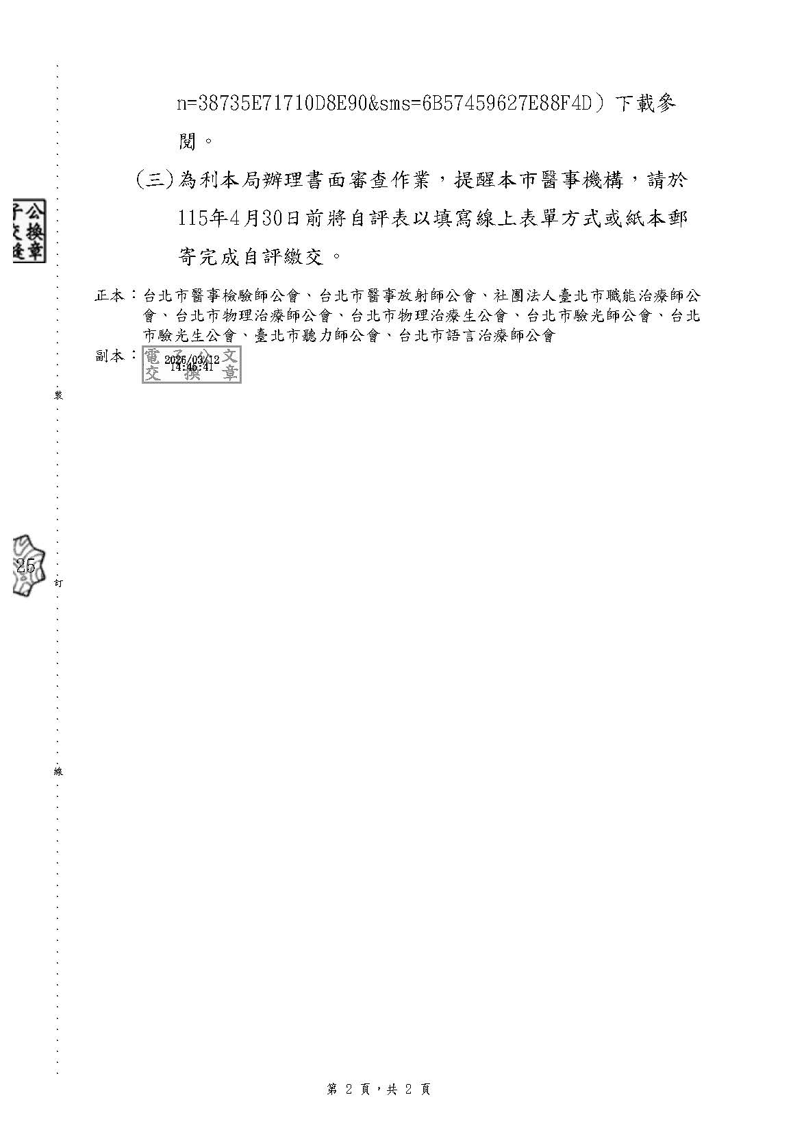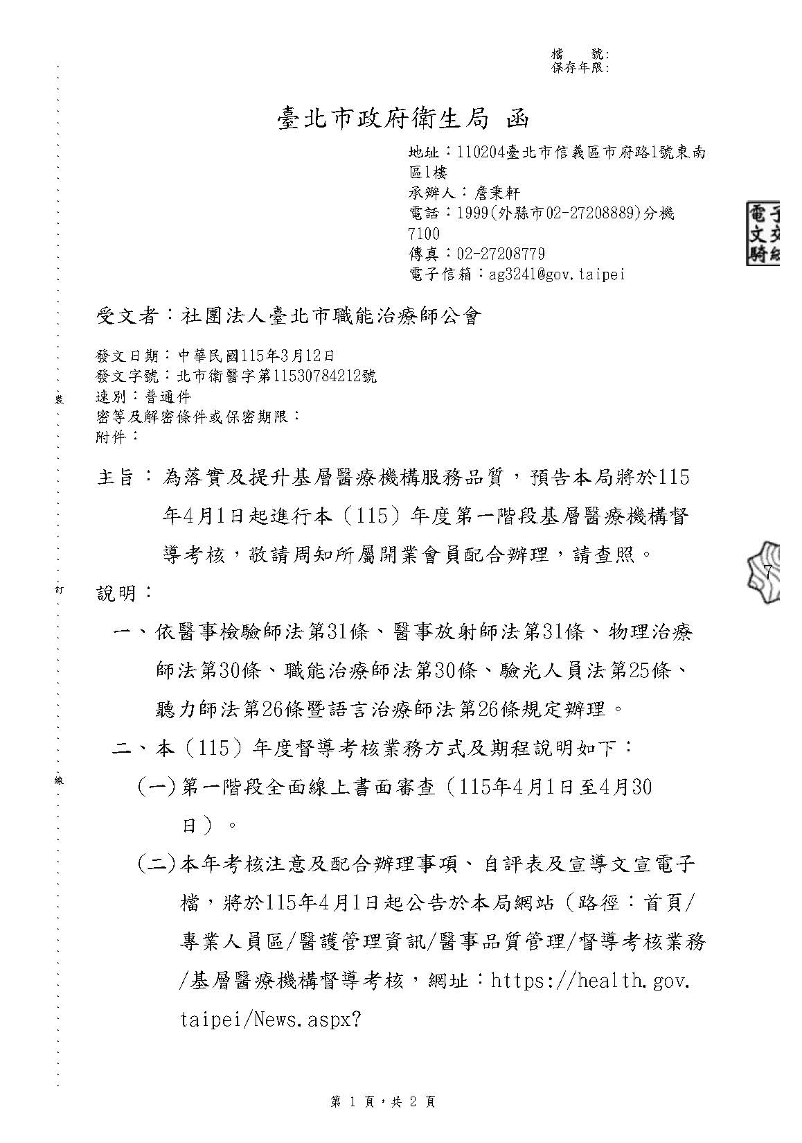 12 03 【公告】北市衛醫字第11530784212號,為落實及提升基層醫療機構服務品質,預告本局將於115 年4月1日起進行本(115)年度第一階段基層醫療機構督 導考核,敬請周知所屬開業會員配合辦理 本會訊息