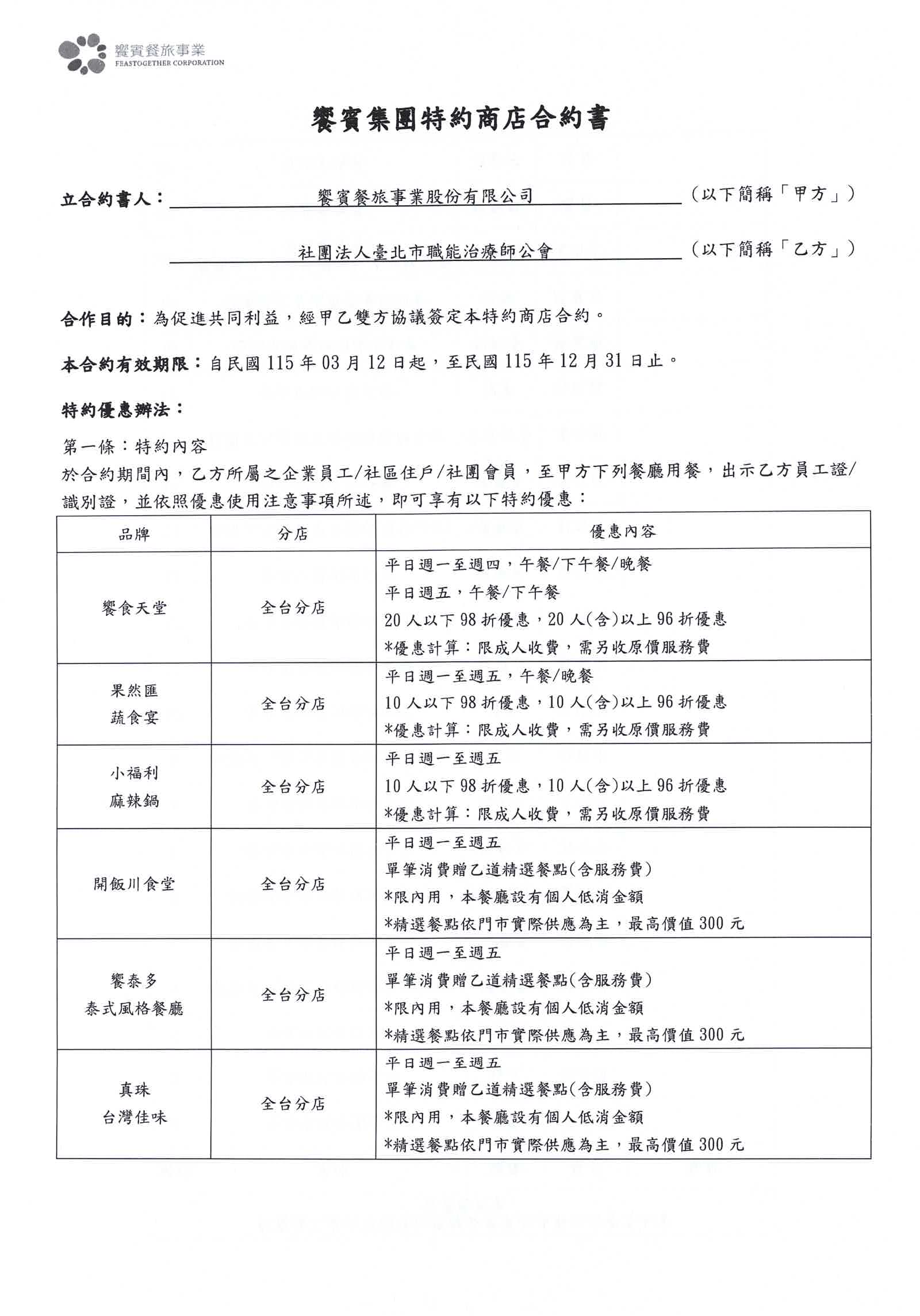 20 03 【2026年度特約商店公告】饗賓集團-饗食天堂、果然匯、小福利、開飯川食堂、饗泰多、真珠台灣家味 聯誼活動訊息 主旨:本會特約商店-饗賓集團-饗食天堂、果然匯、小福利、開飯川食堂、饗泰多、真珠台灣家味 公告對象:全體會員 說明:本會為加強對會員的服務已進行2026年度特約商店之簽約,來店消費出示執業執照,並依照優惠使用注意事項所述,即可享優惠如下: